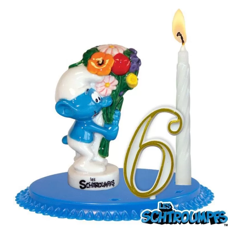 Kit Bougie + Chiffres + Figurine Les Schtroumpfs En Porcelaine Veritable Peinte A La Main, Pour La Décoration D’Un Gateau D’Anniversaire Les Schtroumpfs.